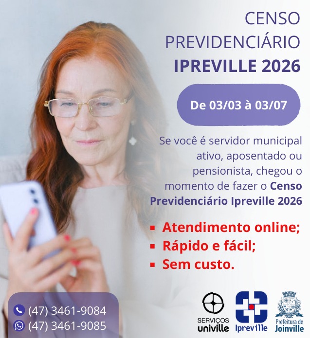 O Censo Previdenciário do Ipreville está sendo realizado em parceria com a Universidade da Região de Joinville (Univille), que irá disponibilizar todo o suporte necessário. Em caso de dúvida, é possível entrar em contato pelo telefone (47) 3461-9084 ou pelo WhatsApp (47) 3461-9085, de segunda a sexta-feira, das 8h às 18h.